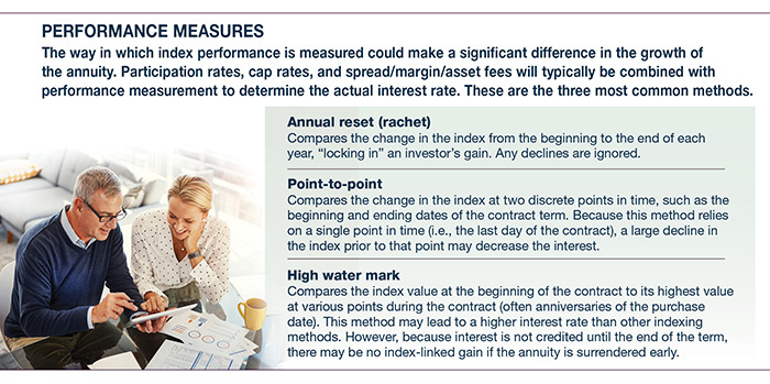 Index performance generally does not include dividends, and the way in which the performance is measured may vary, depending on the contract (see methods below). Participation rates, cap rates, and other fees are set by the insurance company, and some companies reserve the right to change these provisions either annually or at the start of each contract term. These types of changes could affect the investment return.
